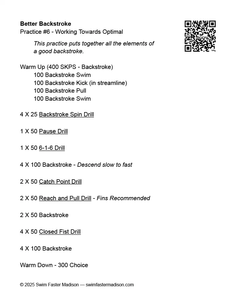 Each practice includes drills that teach effective backstroke technique, integrated with swim sets that reinforce a specific skill.All cards include a QR code linking to YouTube videos that demonstrate the drills.