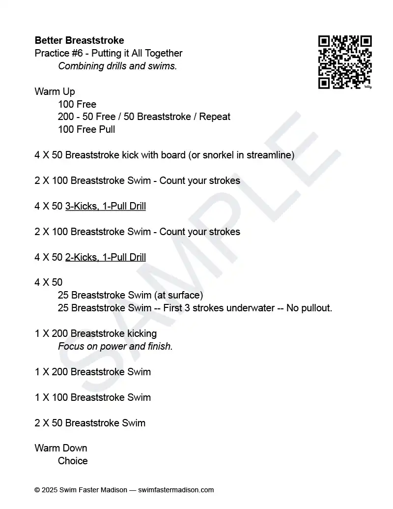 The Better Breaststroke Package is a set of eight progressive swim practices created to help intermediate-level swimmers improve their breaststroke technique.