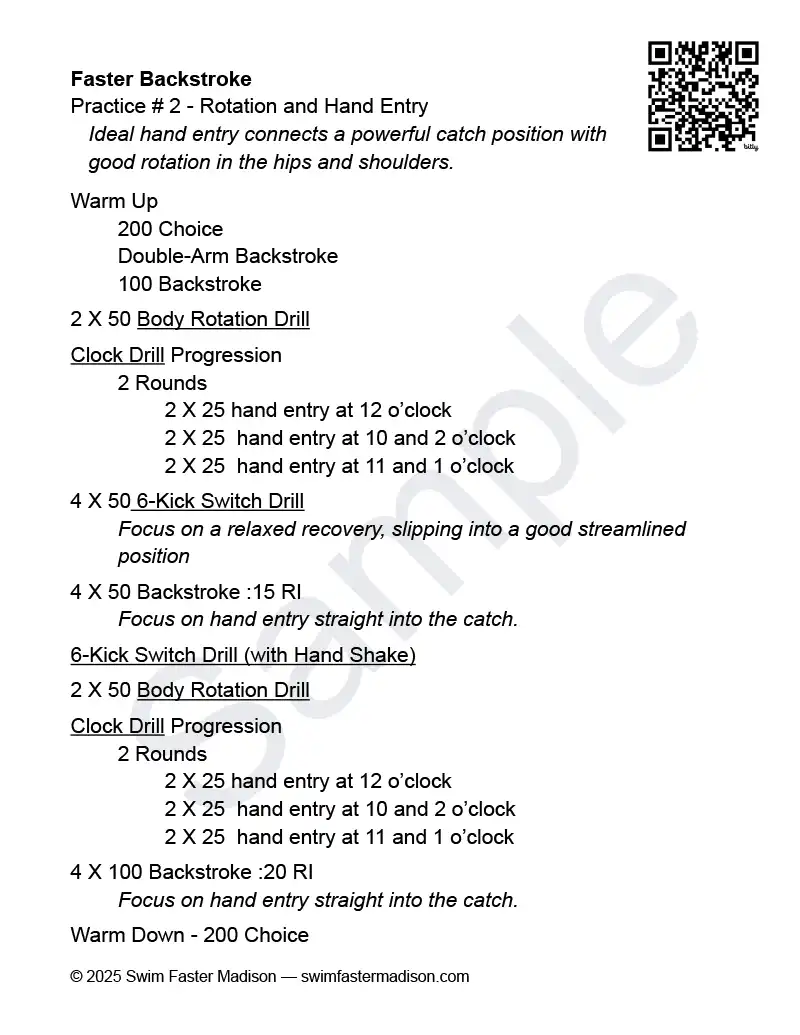 A QR code printed on each practice links to drills on YouTube organized progressively to develop a faster backstroke.